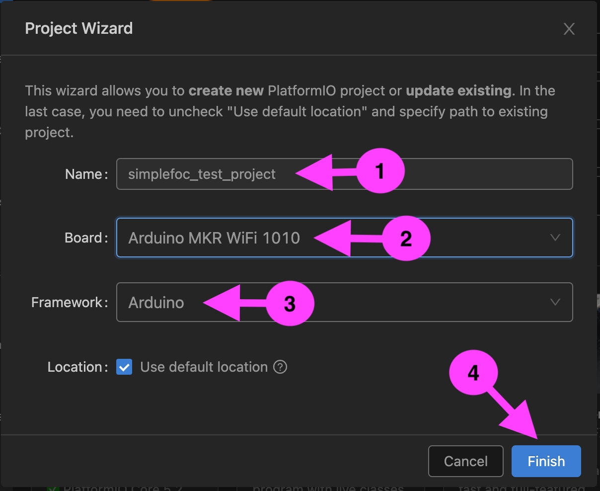 Once you have chosen your board, make sure the Framework “Arduino” is selected. PlatformIO supports other Frameworks, but SimpleFOC is an Arduino Library and must be run in Arduino framework.