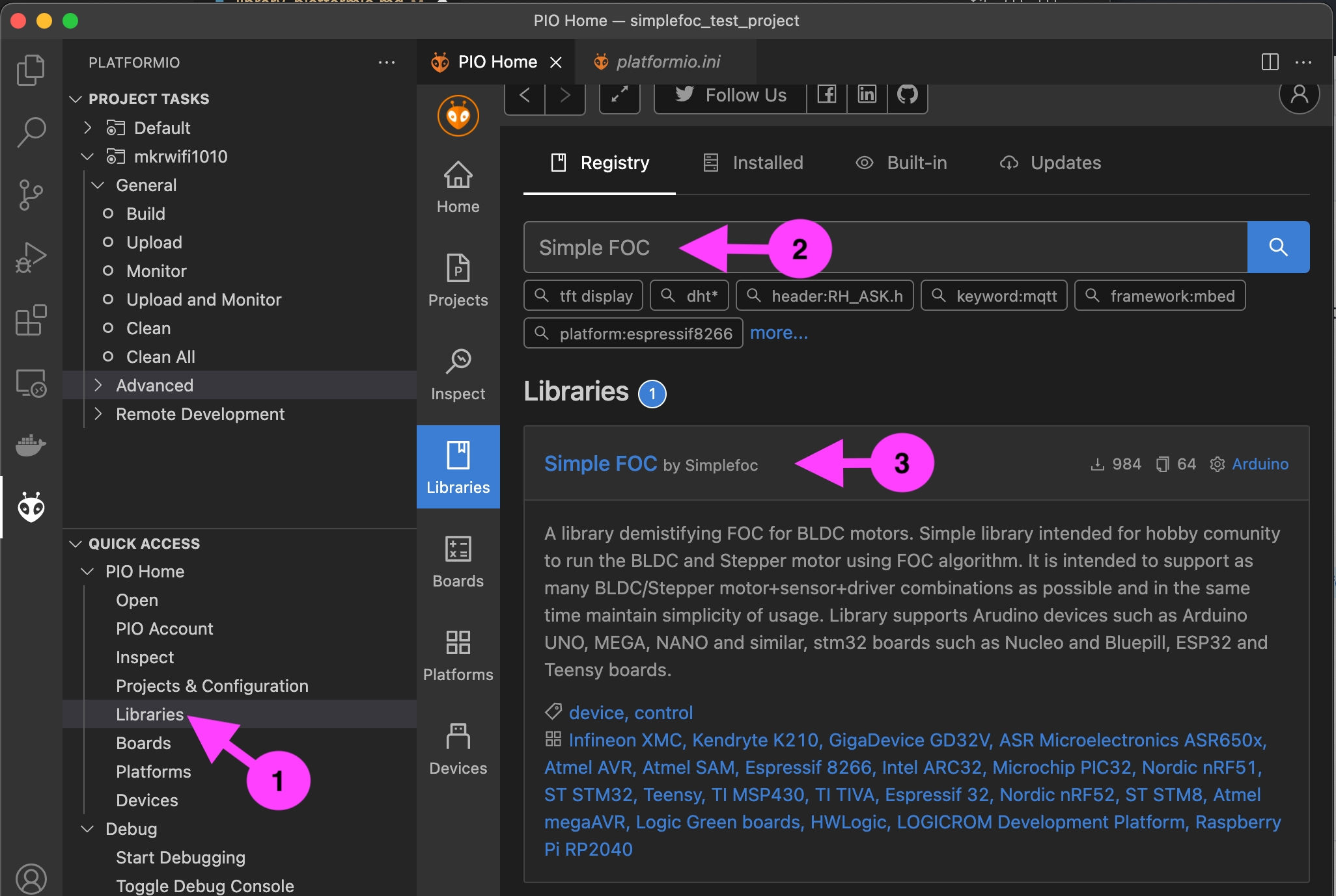 Using SimpleFOC from PlatformIO is not hard at all! The following instructions should get you set up and compiling your code in a matter of minutes.
